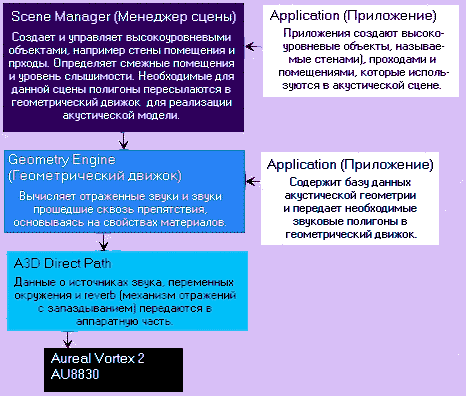 Алгоритмы обсчета путей распространения звуковых волн (wavetracing) компании Aureal воспроизводят эффект распространения звука в окружающей среде; причем это немалая работа с любой точки зрения. В документации с сайта Aureal алгоритмы wavetracing описываются так: Технология Wavetracing компании Aureal анализирует геометрию описывающую трехмерное пространство для определения путей распространения звуковых волн в режиме реального времени, после того, как они отражаются и проходят сквозь пассивные акустические объекты в трехмерной окружающей среде. Существуют три главных компонента: интерфейс A3D, geometry engine (геометрический движок, определяющий геометрию объектов в пространстве) и scene manager (менеджер сцены). Интерфейс A3D является основным компонентом. Один в отдельности он используется для реализации прямых путей распространения звука (direct path). Geometry engine является основным компонетом для обсчета отраженных и прошедших сквозь препятсвия акустических звуковых волн или для Acoustic Wavetracing. Менеджер сцены используется как геометрическим движком, так и интерфейсом A3D для управления сложными звуковыми сценами. Обработка каждого из этих компонетов будет производиться именно в таком порядке. Взаимосвязь и функционирование менеджера сцены, геометрического движка и реализация прямых путей распространения звука показаны ниже: