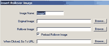 Начнем со вставки rollover image (картинки-перекатыша). В основном, подобные объекты используются для различных навигационых элементов на сайте. В окне диалога есть четыре основных поля. Сверху-вниз это: