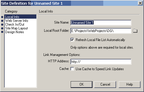 Начнем с первой. Заполняем: · Site name (название сайта) - лобое удобное для вас название (я написал - моя домашняя страничка) · Local Root Folder (локальный корневой каталог) - собственно наш каталог test (см. картинку в начале статьи). · Оставляем как есть галочку напротив Refresh Local File List Automatically · Обязательно включаем пункт Cache [ ] Use Cache to Speed Link Updates - пригодится если мы начнем менять ссылки (быстрее будет) Теперь вторая : В ней мы настраиваем параметры доступа к удаленному серверу (месту, куда мы будем наши файлы выкладывать): · Server Access - доступ к серверу (варианты none - нет, FTP - по FTP, Local/Network - по локальной сети · FTP Host - адрес сервера, на который будут выкладываться файлы, например ftp.cdrom.com · Host Directory - каталог на сервере, будьте внимательны, когда заполняете этот пункт, если ваш каталог набран БОЛЬШИМИ буквами, то вам тоже нужно указывать его название большими буквами, кроме того путь вы указываете от корня, то есть строчка может выглядеть вот так: users/design/ace · Login - имя пользователя, под которым вы заходите на сайт · Password - пароль пользователя, под которым вы заходите на сайт. Пипку save включайте только в том случае, если вы пользуетесь этим компьютером один. Иначе ваш пароль доступа легко достается из registry (он там в открытом виде хранится) · Use Passive FTP и Use Firewall - настройки которые необходимы в конкретных случаях. Например Use Firewall необходимо указывать, если вы ходите через прокси-сервер. Если вы работаете по модему - эти настройки вас не волнуют. Перейдем к третьей закладке: