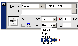 Для начала выберите ячейку таблицы (верхнюю правую) для которой мы отвели место под меню. В свойствах измените горизонтальное и вертикальное выравнивание налево и вниз соответственно (см. рисунок слева).