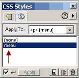 Так, теперь выделяем наше меню нажатием на букву <P> в нижнем левом углу окна. В панели стилей просто выбираем наш стиль (menu). Ну вот, стиль на параграф текста мы назначили. Можно проверить как все это выглядит в браузере. Для этого нужно лишь нажать F12.