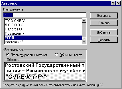 Для этого в меню Сервис выберите команду Автозамена , а затем наберите в списке Заменить аббревиатуру или слово[1] , которое следует автоматически заменять в процессе ввода с клавиатуры и текст[2 ] , который будет появляться взамен указанного. Можно добавлять элементы автозамены в процессе проверки орфографии. Для этого в диалоге Орфография из меню Сервис следует использовать кнопку Автозамена . Элементы автотекста вставляются, если нажать кнопку Автотекст стандартной панели инструментов или выбрать команду Автотекст в меню Правка . Информацию можно вставлять в двух режимах – с сохранением исходного оформления или без сохранения. Автотекст можно использовать для сохранения иллюстрации, графики, часто используемого фрагмента текста и т.д. Для этого необходимо выделить фрагмент, затем нажать кнопку Автотекст , набрать имя для фрагмента и нажать кнопку Добавить . Чтобы вставить элемент Автотекста в текст, наберите его имя и нажмите кнопку Автотекст (или кнопку F3 ). Если Вы не помните имя нужного фрагмента, можно щелкнуть по команде Автотекст в меню Правка и выбрать элемент Автотекста из списка всех существующих элементов. Отличия Автотекста и Автозамены: · Автотекст позволяет запоминать отформатированные фрагменты · Элементами Автотекста могут быть рисунки, графика, таблицы и т.д.