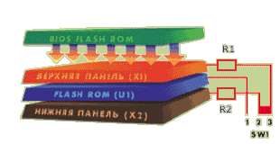Рис. 1. Схематическое изображение IC-Flasher Опишем процесс создания IC-Flasher по пунктам: 1. Микросхема U1 припаивается всеми выводами, кроме вывода "Chip Enable" к нижней панели X2. 2. Верхняя панель X1 припаивается к микросхеме U1 всеми выводами, кроме вывода "Chip Enable".