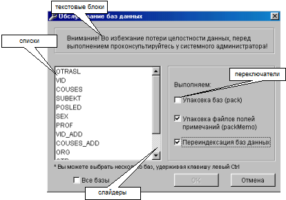Рис.2 Пример кнопок из разрабатываемой системы Переключатели подобны кнопкам выбора, в которых пользователь выбирает значение из фиксированного списка, но в данном случае, пользователь может выбрать более чем одно значение из списка. Слайдеры – обычно это элемент 'полоса прокрутки', они могут быть помещены или в горизонтальную или вертикальную линейку на экране. Метки и текстовые блоки используются для текстовой информации. Различие между ними - текстовые поля, позволяют пользователю вводить текстовые данные в поля, в то время как метки - поля нередактируемые, используемые только для отображения текста, типа подсказок, команд пользователя и т.д. Списки - специализированные средства управления, которые отображают раскрывающиеся списки значений (часто с присоединенными слайдерами, чтобы перемещаться вверх или вниз по списку) и позволяют пользователю выбирать значение из списка, или вводить другое значение в присоединенное текстовое поле. Списки – удобный и компактный элемент интерфейса, который занимает минимум места на экране и в то же время несет большую информационную нагрузку.