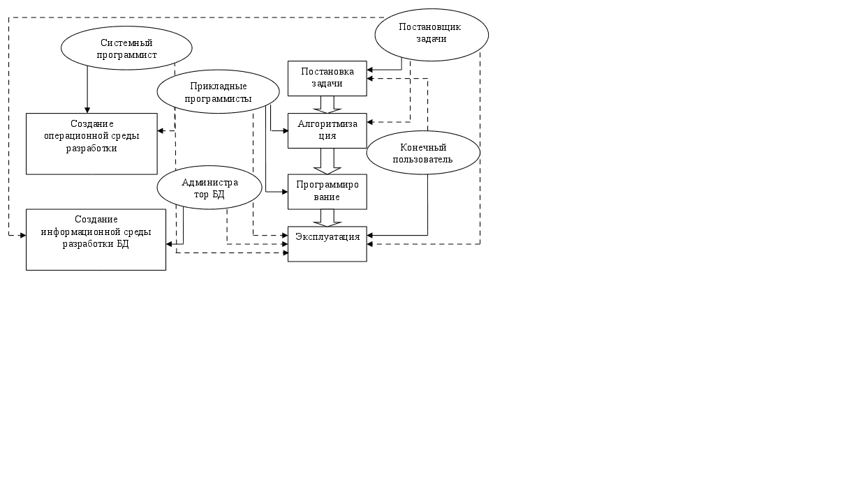 Инф обесп состоит из внеш и внутр. Внешнее содерж правила классификации и кодирования, нормативно-справочной инф, оперативн инф. И инструктированные материалы. Внутреннее-состоит из входных сигналов и данных, промежуточных инф-ных массивов и входных сигналов. Техническое обеспечение (ТО)- или комплекс технических средств ИС состоит из средств: получения, преобразования, передачи и отображения инф, а также выч тех-ки, локального управления и регулирования. Организационное обеспечение(ОО)- это совокупность средств и методов организации производства и управления им в условиях внедрения ИС Целью ОО является: 1)-выбор и постановка задач управления; 2)-анализ системы управления и путей ее совершенствования; 3)-разработка решений по организации взаимодействия ИС и персонала; 4)-внедрение задач управления. Организ обесп включает в себя методики проведения работ, требования к оформлению документов, должностные инструкции и т.д. Кадровое обеспечение (КО)- это совокупность методов и средств по организации и проведению обучения персонала приемам работы в ИС. Целью КО яв-ся поддержание работоспособности ИС и возможности дальнейшего ее развития. КО включает: методику обучения, прграммы курсов и практических занятий, технические средства обучения и правила работы с ними. Этапы проектирования БД (19). Схема решения поставленной задачи происходит следующим образом (Схема1). В процессе создания программы на начальной стадии участвуют постановщики задач. Так как большинство систем работает с базами данными, обеспечивающими работу со многими приложениями, то возникает проблема организационной поддержки баз данных, которую решает администратор баз данных. Потребителем является конечный пользователь, который не является программистом, но владеет навыками работы с вычислительной техникой (ВТ). Существует еще категория – операторы ЭВМ – специально обученные работники для сопровождения прикладных программных продуктов. В данном конкретном случае потребителем конечного продукта предполагается пользователь, владеющий основными навыками работы с персональным компьютером (ПК).