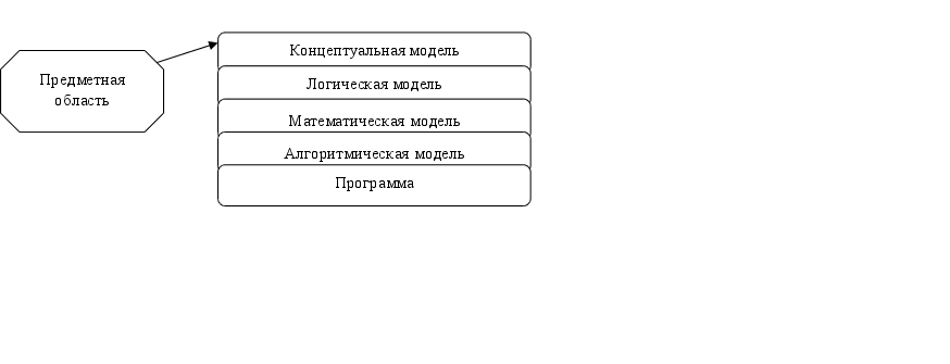 Схема 1. Схема процесса этапов создания программ и взаимодействия участников. Взаимодействие с базой данных. Работа с базой данных, управление и контроль над ее содержимым поддерживается Microsoft Access. Базы данных – это огромные массивы данных, организованных в табличную структуру. Целью разработки любой базы данных является хранение и использование информации о какой-либо предметной области. При разработке базы данных обычно выделяется несколько уровней моделирования, при помощи которых происходит переход от предметной области к конкретной реализации базы данных средствами конкретной СУБД. Можно выделить следующие уровни: Сама предметная область Модель предметной области Логическая модель данных Физическая модель данных Собственно база данных и приложения Для того чтобы оценить качество принимаемых решений на уровне логической модели данных, необходимо сформулировать некоторые критерии качества в терминах физической модели и конкретной реализации и посмотреть, как различные решения, принятые в процессе логического моделирования, влияют на качество физической модели и на скорость работы базы данных. Конечно, таких критериев может быть очень много и выбор их в достаточной степени произволен. Далее будут рассмотрены некоторые из таких критериев, которые являются безусловно важными с точки зрения получения качественной базы данных: Адекватность базы данных предметной области Легкость разработки и сопровождения базы данных Скорость выполнения операций обновления данных (вставка, обновление, удаление кортежей) Скорость выполнения операций выборки данных База данных должна адекватно отражать предметную область. Это означает, что должны выполняться следующие условия: Состояние базы данных в каждый момент времени должно соответствовать состоянию предметной области. Изменение состояния предметной области должно приводить к соответствующему изменению состояния базы данных Ограничения предметной области, отраженные в модели предметной области, должны некоторым образом отражаться и учитываться базе данных. Кроме всего прочего СУБД позволяет: создавать пустую структуру базы данных; предоставлять средства ее заполнения; обеспечивать возможность доступа (Access, FoxPro, SQL-сервер, Delphi, Builder). Алгоритмизация и моделирование. Прежде чем приступить к решению поставленной задачи необходимо ее алгоритмизировать, то есть выбрать конкретный метод решения задачи и оформить в подетальном виде ее модель. В данном конкретном случае выбрана информационная модель решения. Важным инструментом исследования систем является метод моделирования, при котором исследуемый объект заменяется его моделью, то есть некоторым другим объектом, сохраняющим основные свойства реального объекта, но более удобным для исследования или использования. Информационная модель – это отражение предметной области в виде информации. Предметная область представляет собой часть реального мира, который исследуется или используется. Отображение предметной области в информационных технологиях представляется информационными моделями нескольких уровней (рис.2) Концептуальная модель обеспечивает интегрированное представление о предметной области и имеет словооформительный характер. Логическая модель формируется из концептуальной путем выделени