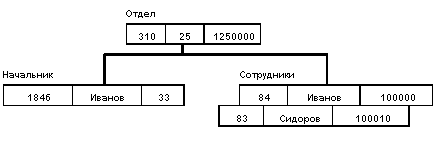 Здесь Отдел является предком для Начальник и Сотрудники, а Начальник и Сотрудники - потомки Отдел. Между типами записи поддерживаются связи. База данных с такой схемой могла бы выглядеть следующим образом (мы показываем один экземпляр дерева):