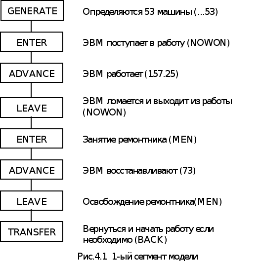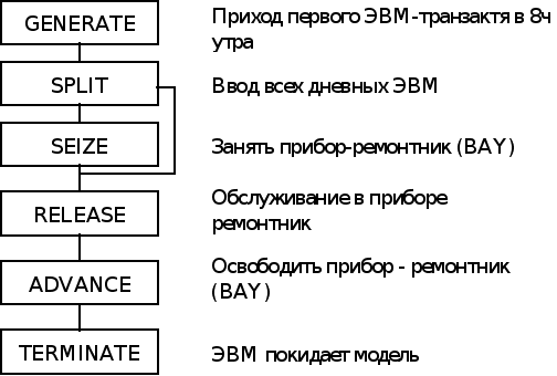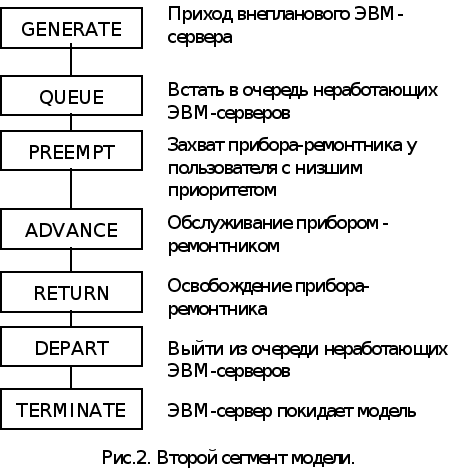 Отметим, что при отсутствии запасных ТЭЗов А и двух запасных ТЭЗах В. нагрузка, равная 74,2 процента (речь идет о Табл.4.стр.1), превышает нагрузку в 70,5, полученную в предыдущем примере. Это противоречит ожидаемому результату. Результаты полученные для случая А=1 и 2 и для В=0 являются сомнительными. Нагрузка в 90,8% для А=1 и В-2 меньше чем 91,2% для предыдущей работы(Табл.5, строка 2).Существуют и ещё неувязки. Модель для эмитации производственной деятельности ВЦ Рассмотрим следующий вопрос: "Разработать модель для имитации производственной деятельно ВЦ при планово- предупредительном обслуживании эксплуатируемого парка ЭВМ. По полученной модели оценить распределение случайной переменной "число машин, находящихся на внеплановом ремонте". Рассматриваемый ВЦ имеет в своем составе парк ЭВМ , обеспечивающий среднюю производительность. и базирующийся на ЭВМ IBM PC с ЦП типа 386SX и 386DX. Кроме: этого на ВЦ используются в качестве сетевых серверов машины типа 486DX и Pentium, поддерживающие локальные сети, в которых осуществляется сложная цифровая обработка больших цифровых массивов информации , кроме этого, решаются задачи разработки цветных изображений. На ВЦ принято планово-профилактическое обслуживание. ВЦ с небольшим парком ЭВМ и поэтому ремонтом ЭВМ занимается всего один радио-механик ( в терминах СМО - ремонтник). Это означает: что одновременно можно выполнять обслуживание только одной ЭВМ. Все ЭВМ должны регулярно проходить профилактический осмотра. Число эвм подвергающееся ежедневному осмотру согласно графика, распределено равнлмерно и составляет от 2 до 6. Время, необходимое для осмотра и обслуживания каждой ЭВМ примерно распределено в интервале от 1,5 до 2,5 ч. За это время необходимо проверить саму ЗВМ, а также такие внешние ус-ва как цветные струйные принтеры, нуждающиеся в смене или заправке катриджей красителем. Несколько ЭВМ имеют в качестве внешних устройств цветные плоттеры (графопостроители) , у которых достаточно сложный профилактический осмотр. Рабочий день ремонтника длится 8 ч, но возможна и многосменная работа. В некоторых случаях профилактический осмотр прерывается для устранения внезапных отказов сетевых серверов, работающих в три смены, т.е 24 ч в сутки. В этом случае текущая профилактическая работа прекращается, и ремонтник начинает без задержки ремонта сервера. Тем не менее, машина-сервер, нуждающаяся в ремонте, не может вытеснить другую машину-сервер, уже стоящую на внеплановом ремонте. Распределение времени между поступлениями машин-серверов является пуассоновским со средним интервалом равным 48 ч. Если ремонтник отсутствует в момент поступления ЭВМ эти ЭВМ должны ожидать до 8ч утра. Время их обслуживания распределено по экспоненте со средним значение в 25 ч.Необходимо построить GPSS-модель для имитации производственной деятельности ВЦ. По полученной модели необходимо оценить распределение случайной переменной "число машин-серверов, находящихся на внеплановом ремонте". Выполнить прогон модели, имитирующей работу ВЦ в течении 25 дней, введя промежуточную информацию по окончании каждых пяти дней. Для упрощения можно считать, что ремонтник работает 8 ч в день без перерыва, и не учитывать выходные. Это аналогично тому, что ВЦ работает 7 дней в неделю. Метод построения модели Рассмотрим сегмент планового осмотра ЭВМ. (Рис.1.). Тра