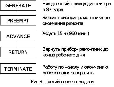Рис.1. Первый сегмент Сегмент "внепланового ремонта"ЭВМ-серверы, нуждающийся во внеплановом ремонте, двигаются в модель в своём собственном сегменте. Использование ими прибора имитируется простой последовательностью блоков PREEMPT-ADVANCE- RETURN. Блок PREEMPT подтверждает приоритет обслуживания ЭВМ-сервера (в блоке в поле В не требуется PR) (Рис.2.) Сегмент "начало и окончание" рабочего дня ВЦ. Для того, чтобы организовать завершение текущего дня работы ВЦ по истечении каждого 8-ми ч дня и его начала в 8 ч утра, используется специальный сегмент. Т Транзакты-диспетчер входит в этот сегмент каждые 24 ч (начиная с конца первого рабочего дня), Этот транзакт, имеющий в моделе высший приоритет, затем немедленно поступает в PREEMPT, имеющий в поле В символа PR. Диспетчеру, таким образом, разрешено захватывать прибор-ремонтник вне зависимости от того, кем является текущий пользователь (если он есть). Далее, спустя 16 ч, диспетчер освобождает прибор-ремонтник, позволяя закончить ранее прерванную работу (при наличии таковой).(Рис.3.) Сегмент "сбор данных для неработающих ЭВМ-серверов". Для сбора данных, позволяющих оценить распределение числа неработающих ЭВМ-приборов, используется этот отдельный сегмент. (Рис.4.) Для этих целей используется взвешенные таблицы, которые позволяют вводить в них в один и тот же момент времени наблюдаемые случайные величины. Для этих целей включаются два блока - TABULATE, но если ввод в таблицу случаен (значение величин і2), то этот подход не годен. В этом случае используется необязательный элемент олеранд, называемый весовым фактором, обозначающий число раз, которое величина, подлежащая табулированию, должна вводится в таблицу. Это позволяет назначать разые веса различным наблюдаемым величинам. Сегмент "промежуточная выдача". и окончание моделирования в конце дня используется последовательность GENERATE-TERMINATE (Рис.5.). Cегменты представлены на рис.1 - 5.