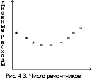 Программа STORAGE 5$MEN,3/5$NOWON,50 * * MODEL SEGMENT 1 * 1 CNTRL GENERATE ,,,53 2 ENTER NOWON , 3 ADVANCE 157,25 4 LEAVE NOWON 5 ENTER MEN 6 ADVANCE 7,3 7 LEAVE MEN 8 TRANSFER ,BACK * * MODEL SEGMENT 2 * GENERATE 6240 TERMINATE 1 * * CONTROL * START 1 1 CNTRL GENERATE ,,,54 CLEAR START 1 1 CNTRL GENERATE ,,,55 CLEAR START 1 STORAGE 5$MEN,4 1 CNTRL GENERATE ,,,53 CLEAR START 1 1 CNTRL GENERATE ,,,54 CLEAR START 1 1 CNTRL GENERATE ,,,55 CLEAR START 1 STORAGE 5$MEN,5 1 CNTRL GENERATE ,,,53 CLEAR START 1 1 CNTRL GENERATE ,,,53 CLEAR START 1 1 CNTRL GENERATE ,,,54 CLEAR START 1 1 CNTRL GENERATE ,,,55 CLEAR START 1 END Оценка результатов При фиксированном числе ремонтников и при достаточно малом числе -арендуемых машин, расходы велики из-за снижения производительности ВЦ. При большом числе Дарендуемых машин, расходы велики из-за их избыточного числа. Очевидно, необходимо найти минимум между этими значениями (Рис.4.2).