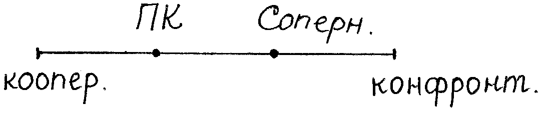 кооперацию и конкуренцию, при этом конкуренцию в виде межличностного конфликта лучше, чем кооперацию. Шмелев вводит континуум форм взаимодействия. На полюсах – кооперация и конфронтация. Продуктивная конкуренция ближе к полюсу кооперации, чем к полюсу конфронтации. ПК – кооперативный заряд. Объединение усилий людей,... по созданию единого объекта, предназначенного для совместного использования или на продажу. Кооперация: 2 основные черты совм. деят. по Леонт: разделение единого проц. м. уч-ками и изменение деят. каждого (т. к. предмет и мотив не совпад). Конкуренция: Под конфликтом понимается противоречие в намерениях, целях, ценностях и т. д. сторон. Конфликт связан с понятием противоречия. Структуре конфликта: 1. стороны конфликта;2. конфликтную ситуацию – объективная ситуация этого противоречия;3. осознание конфликтной ситуации участниками, образ конфликтной ситуации (хотя бы одним из них);4. конфликтное взаимодействие (собственно поведение) – в обыденном – понимаем только это; 5. исход (результат) этого конфликтного взаимодействия. Функциях конфликта: конструктивная и деструктивная. Уровни конфликта:1. внутриличностный;2. межличностный;3. внутригрупповой; 4. межгрупповой. Образ конфликтной ситуации (КС). 1. Если присутствует и реальная ситуация противоречия, и осознание – это – истинный конфликт. 2. КС есть, противоречие существует но не осознается участниками – латентный (потенциальный) конфликт 3. Объективного противоречия нет, а кому-то кажется, что есть – ложный конфликт. 4. Условный (случайный) конфликт (сражаются за ресурс, который не является единственным. 5. Неверно приписанный конфликт (когда хотя бы одна из сторон реального взаимодействия не является истинной стороной конфликта, например, руководитель ругает сотрудника за то, что он выполняет распоряжения непосредственного начальника). 6. Смещенный конфликт (за внешним поводом конфликта скрывается более глубокая истинная его причина). О стратегиях поведения в конфликте. Стратегия поведения в конфликтных ситуациях (в основе – представление об ориентации человека на собственные интересы или интересы партнера - Томас): 1. собственные интересы противоборство, конкуренция и борьба. 2. Ориентация на интересы партнера и собственные – высоки –стратегия сотрудничества. 3. Стратегия компромисса – пожертвовать своими на уступку партнера. 4. Приспособление – ориентация на интересы партнера в ущерб собственным, 5. Стратегия ухода, избегания – стратегия ухода от конфликта.