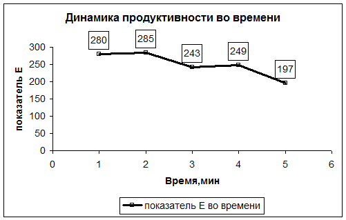 Для 1 минуты: А1=(67-1)/(67+0)»0,99 - 5 ранг , Е1= 283*0,99 »280 - 4 ранг . Для 2 минуты: А2=(75-1)/(75+0)»0,99 - 5 ранг , Е2= 288*0,99 »285 - 4 ранг . Для 3 минуты: А3=(58-0)/(58+0)=1 - 5 ранг , Е3= 243*1=243 - 3 ранг . Для 4 минуты: А4=(61-0)/(61+0)=1 - 5 ранг , Е4= 229*1=229 - 3 ранг . Для 5 минуты: А5=(53-2)/(53+0)»0,96 - 4 ранг , Е5= 205*0,96»197 - 2 ранг . Показатель А: по 4(первым) минутам - очень высокий уровень; последняя минута - высокий уровень. Показатель Е: 1-ая и 2-ая минуты - высокий уровень; 3-я и 4-ая минуты - средний уровень; 5-ая минута - низкий уровень. Здесь можно сделать вывод о том, что с течением времени у испытуемого наблюдается яркое снижение продуктивности в работе. КОЛИЧЕСТВЕННЫЙ АНАЛИЗ. 1. Выявление преимущественной установки на скорость и/или на точность выполнения задания: А: По полученным результатам (см. выше) видно, что у испытуемого очень высокая точность выполнения задания. В: Количество обработанных символов, которое равняется 1248, говорит о том, что скорость у данного испытуемого также высока. Вывод: преимущественной установки - либо на скорость, либо на точность - у данного испытуемого не выявлено, поскольку оба показателя имеют достаточно высокую степень. 2. Определение концентрации внимания (по кол-ву допущенных ошибок): В своей работе испытуемым было допущено 4 ошибки (неправильно вычеркнутые буквы). В соответствии со среднестатистическим нормативом (от 3 до 9 ошибок - средний уровень) здесь можно говорить о средней степени концентрации внимания. А также, как видно из данных в таблицах (ошибки допущены на 1,2 и 5 минутах), концентрация внимания гораздо ниже в начале и в конце работы, чем в середине. 3. Определение объёма внимания (по общему количеству обработанных символов): В= 283+288+243+229+205=1248. В соответствии со среднестатистическим нормативом (выше 850 символов - высокий результат) этот результат говорит об очень высоком объёме внимания. 4. Определение распределения внимания (кол-во пропущенных Н и К): В ходе работы испытуемый не допустил ни одного пропуска среди заданных букв, следовательно, у данного испытуемого уровень распределения внимания в норме. 5. Определение устойчивости внимания (определяется по динамике продуктивности работы (Е) во времени):