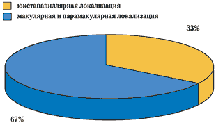 Рис. 2. Распределение больных с учетом локализации С учетом локализации опухоли ранним признаком ее, заставившей больных обратиться к офтальмологу, практически во всех случаях явилось снижение зрения. К моменту обследования гемангиома имела толщину, равную в среднем 3±0,7 мм (от 1,6 до 3,9 мм), а основание ее достигало в среднем 8,9±3,2 мм (от 3,8 до 13,5). Во всех случаях имелась вторичная отслойка сетчатки (в 6 случаях плоская, в 3–х – высокая). При УЗ–сканировании у всех больных определялся проминирующий гиперэхогенный очаг без «экскавации» хориоидеи с ровной поверхностью. При исследовании в режиме ЦДК во всех случаях, независимо от размеров отграниченной гемангиомы, выявлено равномерное распределение новообразованных сосудов по всей ее толщине и площади. Визуально кровоснабжение гемангиомы осуществляется за счет сосудов хориоидеи: сосуды сетчатки не участвуют в ее питании (рис. 3, 4) Только при юкстапапиллярной локализации (3 случая) опухоль получала двойное кровоснабжение – за счет сосудов хориоидеи и ЦАС (рис. 5).