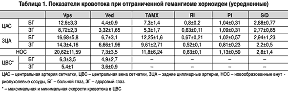 С учетом того, что хориоидея наполняется из бассейна задних цилиарных артерий, представляет интерес, как меняется кровоток в них при хориоидальной опухоли и, в частности, при гемангиоме. Оказалось, что скорость кровотока в задних цилиарных артериях здоровой и больной сторон отличаются и составляют 14,3±4,16 см/с и 16,68±5,8 см/с соответственно. Таким образом, в задних цилиарных артериях при гемангиоме хориоидеи отмечается усиление кровотока в среднем на 16,6%, что можно объяснить необходимостью усиленного притока к опухоли. При гемангиоме хориоидеи отмечается также увеличение кровотока в ЦАС и ЦВС. По сравнению со «здоровой» стороной кровоток в ЦАС увеличен в среднем на 44,4%, что касается кровотока в ЦВС – он увеличен лишь на 18,9%. Хотя исследуемые нами группы не многочисленны, тем не менее удалось выявить зависимость кровотока в ЦАС в зависимости от локализации опухоли. Так, систолическая скорость кровотока в ЦАС при гемангиоме юкстапапиллярной локализации в среднем составила 15,13 см/с, а при макулярной и парамакулярной локализациях – 10,8 см/с. То есть именно при юкстапапиллярной гемангиоме кровоток в ЦАС усилен по сравнению с гемангиомой макулярной и парамакулярной локализации на 40,1%. Вероятно, увеличением общего притока крови к глазу при гемангиоме хориоидеи можно объяснить такие клинические признаки, как выраженная экссудативная реакция, сопровождающая вторичную отслойку сетчатки даже при небольшой ее проминенции, которые особенно выражены при юкстапапиллярной гемангиоме. Анализ гемодинамики в новообразованных сосудах опухоли свидетельствует, что пиковая систолическая скорость и конечная диастолическая скорость в них достаточно высоки и превышают таковые в ЗЦА в 1,2 и 1,1 раза соответственно. Именно этим и можно объяснить быстрое «вымывание» флюоресцеина при флюоресцентной ангиографии, на что имеются указания в литературе [7, 13]. Зависимости между степенью выраженности кровотока и размерами опухоли в анализируемой группе не выявлен (табл. 2).