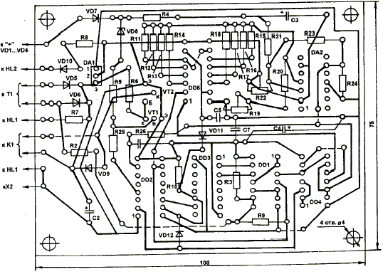 Рис 1.1 Все постоянные резисторы, используемые в зарядном устройстве — МЛТ, а подстроенные (R19, R22) —СПЗ-38. Резисторы матрицы (R11...R18) желательно подобрать так, чтобы сопротивления двух соседних резисторов отличались друг от друга ровно в два раза. Если такой возможности нет, можно обойтись и без подбора резисторов, однако в этом случае, возможно, не будет обеспечена равномерность изменения напряжения на выходе матрицы, что, впрочем, мало повлияет на работу устройства в целом. Резисторы с сопротивлениями, выходящими из стандартного ряда (R12, R17, R18), можно составить из двух последовательно включенных резисторов стандартных номиналов. Конденсатор С1 — типа МБГЧ с номинальным напряжением 250 В. При использовании металлобумажных конденсаторов других типов (МБГО, МБГП и др.) их номинальное напряжение должно быть не менее 400.. .500 В. Конденсатор С2 — К50-29, СЗ — К52-1 Б, С4 — К53-4, остальные конденсаторы — КМ-5 или КМ-6. Вообще, устройство некритично к выбору элементов. Так, в качестве С2...С4 могут быть использованы оксидные конденсаторы любых типов, подходящие по емкости и номинальному напряжению. Стабилизатор напряжения 78L09 (DA1) можно заменить любым отечественным микросхемным стабилизатором напряжения на 9 В, например КР1157ЕН902. В качестве DA2 можно использовать компаратор К521САЗ, однако это потребует изменения трассировки печатной платы. Диоды выпрямительного моста VD1...VD4 должны допускать прямой ток не менее 2 А. В случае, когда не исключаются ошибочные подключения аккумуляторной батареи в обратной полярности, лучше применить диоды с некоторым запасом по допускаемому прямому току, особенно в импульсе. Можно порекомендовать диоды серии КД206, КД213. Диоды КД106А (VD5, VD6) можно заменить диодами серий КД105, Д226, Д237; остальные —диодами серий Д220, Д223, Д311, Д312. Вместо стабилитрона КС522А (VD8) можно применить КС220Ж или два последовательно включенных стабилитрона Д814В. В качестве VT1 можно применить любой маломощный n-p-n транзистор с постоянным напряжением коллектор-эмиттер не менее 30 В и коэффициентом передачи тока базы более 40. Подойдут транзисторы указанной на схеме серии КТ3102 с любым буквенным индексом кроме Г и Е, КТ315Г, КТ312В. Вместо КТ608Б можно применить транзисторы из серий КТ503, КТ807. В устройстве использовано реле РКМП, с сопротивлением обмотки 600 Ом и током срабатывания 20 мА. Можно использовать любое реле с одной группой нормально разомкнутых контактов, допускающих коммутацию переменного напряжения 220 В, с коммутируемым током не менее 0,3 А. Реле должно надежно срабатывать при напряжении не более 12 В и токе 20..40 мА. Подойдут реле РЭС22. Применимы реле РЭС6, у которых неиспользуемую группу контактов желательно немного отогнуть для уменьшения тока срабатывания. Кнопка SB1 — КМ1, КМ2-1. В качестве предохранителей FU1, FU2 желательно использовать быстродействующие плавкие вставки ВПЗТ-2, которые можно заменить на ВП1. В зарядном устройстве применен унифицированный трансформатор ТПП277-127/220-50 с номинальной мощностью 72 Вт и током вторичных