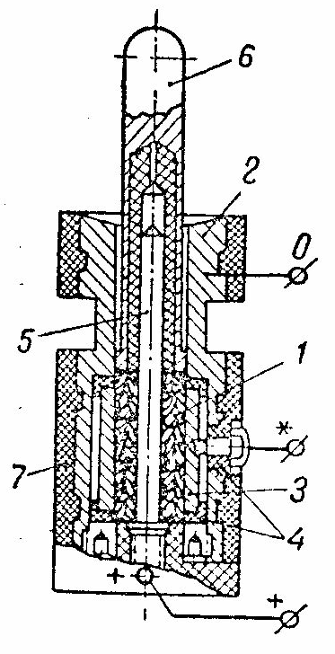 Г. Б. Пузрин предложил в конце 30-х годов конструкцию зерна, в котором постоянная навеска зерна подвергается сжатию в постоянном объеме с помощью ручного пресса. Эта конструкция была применена, во влагомере ВП-4 Г. Б. Пузрина для зерна, нашедшем в последующем значительное распространение в хлебозаготовительной системе На рис.1 приложения … показана конструкция электродного устройства влагомера ВЭ-2, представляющего собой модификацию прибора ВП-4, разработанную в последние годы. Навеска зерна 1 (для пшеницы, ржи, ячменя — 8 г, для овса — 7 г) насыпается в металлический стакан 2. Одним из электродов служит кольцо 3. изолированное от стакана с помощью прокладок 4. Второй, центральный, электрод 5 соединен с корпусом датчика. Конструкция электродов рассчитана на уменьшение влияния сопротивления торцовых частей брикета зерна. Пуансон 6 служит для уплотнения образца; давление на пуансон создает ручной винтовой пресс, снабженный визирным устройством, указывающим предел вращения зажимного винта при каждом прессовании образца. Это устройство должно обеспечить постоянство давления на образец при определениях влажности. Стакан 2 заключен в футляр 7 из диэлектрика, который по замыслу авторов конструкции при выполнении измерения предохраняет датчик от нагревания руками лаборанта. У описанного датчика необходимо часто (по инструкции к прибору ВЭ-2 перед каждой сменой) проверять правильность установки визирного устройства. Проверка выполняется с помощью контрольного цилиндра, вставляемого в датчик; в случае необходимости положение визирного устройства корректируется.
