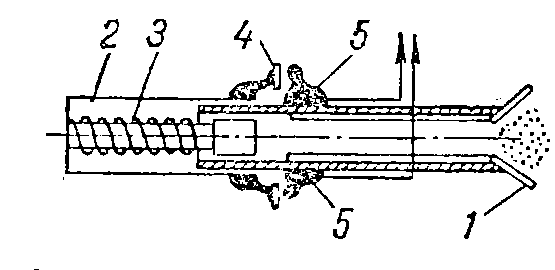 Ограничение силы сжатия материала калиброванной пружиной применено в датчике для формовочной смеси литейного производства (Приложение … рис1). Датчик-щуп имеет электроды в виде наклонных латунных пластинок 1, погружаемых в формовочную смесь. По мере погружения электродов смесь уплотняется и ее механическое сопротивление возрастает. Давление на рукоятку 2 передается электродам пружиной 3 через шток. При определенном усилии, соответствующем давлению электродов на грунт, равному 0,5 кГ/см2, кольцо 4 замыкает выключатель 5 и вводит электроды в измерительную цепь.