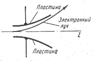 где l'+L'=L — расстояние от экрана до центра отклонения. Нетрудно видеть, что касательная к параболической траектории электронов, построенная източки пересечения параболы с плоскостью, проходящей через ыходные края пластин, пересечет ось на расстоянии 1/2 от краев конденсатора. Таким образом, в случае плоскопараллельных отклоняющих пластин центр отклонения совпадает с геометрическим центром отклоняющей системы.