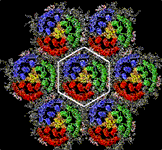 в виде пурпурных мембран (ПМ), образующих двумерные кристаллы с гексагональной решеткой. Эти участки содержат сам белок, некоторые липиды, каротиноиды и воду (рис.3). Обычно они имеют овальную или круглую форму со средним диаметром около 0,5 мкм и содержат около 25 % липидов и 75 % белка. ПМ устойчивы к солнечному свету, воздействию кислорода, температуре более чем 80ºC (в воде) и до 140ºC (сухие), рН от 0 до 12, высокой ионной силе (3 М NaCl), действию большинства протеаз, чувствительны к смесям полярных органических растворителей с водой, но устойчивы к неполярным растворителям типа гексана. Большое практическое значение имеет существующая возможность встраивания ПМ в полимерные матрицы без потери фотохимических свойств.