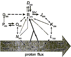 . Оттуда начинается фотоцикл, который приводит к транспорту протона через мембрану. В течение перехода L