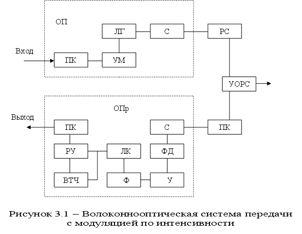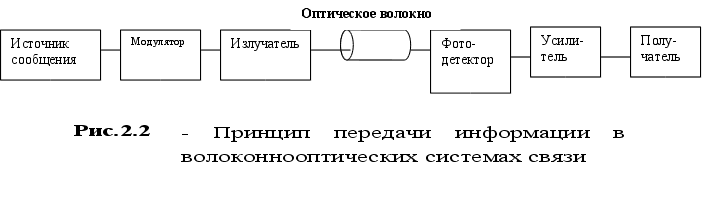 В наиболее общем виде принцип передачи информации в волоконно-оптических системах связи изображен на рис.2.2. На передающей стороне на излучатель света, в качестве которого в волоконнооптической системе связи используется светодиод или полупровод-никовый лазер, поступает электрический сигнал, предназначенный для передачи по линии связи. Этот сигнал модулирует оптическое излучение источника света, в результате чего электрический сигнал преобразуется в оптический. На прием-ной стороне сигнал из оптического волокна вводится в фотодетектор. В современных волоконнооптических системах передачи в качестве фотоде-тектора используют p-i-n или лавинный фото диод. Фотодетектор преобразует падающее на него оптическое излучение в исходный электрический сигнал. Затем электрический сигнал поступает на усилитель (регенератор) и отправляется получателю сообщения.