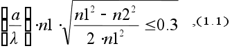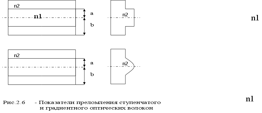 где - длина волны передаваемого излучения, n1 и n2 – показатели преломления материалов световода. Если неравенство (1.1) не удовлетворено, то в световоде устанавливается многомодовый режим. Очевидно, что тип модового режима зависит от характеристик световода (а именно радиуса сердцевины и величины показателей преломления) и длины волны передаваемого света. Различают световоды со ступенчатым профилем, у которых показатель преломления сердцевины n1 одинаков по всему поперечному сечению, и градиентные - с плавным профилем, у которых n1 уменьшается от центра к периферии (рис.2.6). Фазовая и групповая скорости каждой моды в световоде зависят от частоты, то есть световод является дисперсной системой. Вызванная этим волноводная дисперсия является одной из причин искажения передаваемого сигнала. Различие групповых скоростей различных мод в многомодовом режиме называется модовой дисперсией. Она является весьма существенной причиной искажения сигнала, поскольку он переносится по частям многими модами. В одномодовом режиме отсутствует модовая дисперсия, и сигнал искажается значительно меньше, чем в многомодовом, однако в многомодовый световод можно ввести большую мощность.