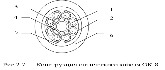 На сегодняшний день промышленностью выпускаются оптические кабели имеющие четыре и восемь волокон(марки ОК). Конструкция ОК-8 приведена на рис.2.7. Оптические волокна 1 (многомодовые, ступенчатые) свободно располагаются в полимерных трубках 2. Скрутка оптических волокон – повивная, концентрическая. В центре – силовой элемент 3 из высокопрочных полимерных нитей в пластмассовой трубке 4. Снаружи – полиэтиленовая лента 5 и оболочка 6. Кабель ОК-4 имеет принципиально те же конструкцию и размеры, но четыре ОВ в нем заменены пластмассовыми стержнями.