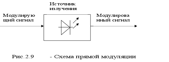 Построение передающих и приемных устройств в волоконнооптических системах передачиВиды модуляции оптических колебаний.Для передачи информации по оптическому волокну необходимо изменение параметров оптической несущей в зависимости от изменений исходного сигнала. Этот процесс называется модуляцией. Существует три вида оптической модуляции: Прямая модуляция. При этом модулирующий сигнал управляет интенсивностью (мощностью) оптической несущей. В результате мощность излучения изменяется по закону изменения модулирующего сигнала (рис.2.9).
