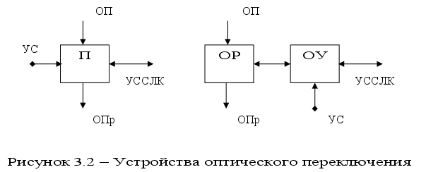 Будем рассматривать устройства оптического переключения двух вариантов – оптические переключатели (П) и соединение оптического разветвителя ОР с оптическим усилителем ОУ. Управляющий сигнал поступает в первом случае на управляющий вход переключателя, во втором – по цепи управления направлением оптической волны накачки оптического усилителя. Максимальная длина регенерационного участка для второй группы схем определяется соотношением: