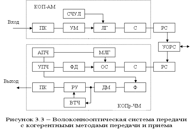 В когерентных оптических приемниках (КОПр) используется местный лазерный генератор (МЛГ) с узкой линией излучения и устройство автоматической подстройки его частоты (АПЧ), оптический сумматор (ОС), усилитель промежуточной частоты (УПЧ), а также демодулятор (ДМ), амплитудный или частотный, в зависимости от вида модуляции принимаемого сигнала. В такой схеме достигается максимальная длина регенерационного участка. Кроме того возможна другая схема одноволоконной оптической системы передачи третьей группы, в которой в одном направлении передачи использована модуляция по интенсивности, а в другом – когерентная модуляция (КОИ-АМ или КОИ-ЧМ) оптического сигнала. На рисунке 3.4 приведена схема, в которой использована модуляция по интенсивности оптических сигналов электрическими сигналами, описываемыми ортогональными (на тактовом интервале) функциями. В отличие от волокон-нооптической системы передачи первой группы (рисунок 3.1), оптические передатчики таких систем содержат генераторы ортогональных сигналов (ГОС1 и ГОС2), а в оптических приёмниках использованы корреляционные демодуляторы (КДМ). Для подстройки генератора ГОС2 используется выделитель ортогонального сигнала (ВОС) и компаратор (КОМ).