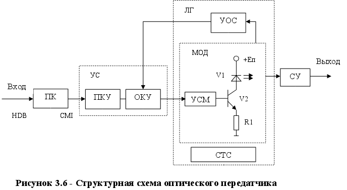 П 3.2.Окончательный выбор структурной схемы передатчика.Выбор способа организации одноволоконного оптического тракта.При проектировании одноволоконных оптических систем передачи с оптимальными характеристиками выбор структурной схемы системы и используемых технических средств определяется критериями оптимальности. Если критерием является минимальная стоимость, то в оптимальной системе должны использоваться оптические разветвители. Максимальная длина регенерационного участка требует применения оптических циркуляторов, переключателей, оптических усилителей, когерентных методов передачи сигнала. Требования высокой надежности и стойкости к внешним воздействиям определяют выбор системы с оптическим источником на одном конце линии, а требование максимального объема передаваемой информации – системы со спектральным уплотнением или с когерентными методами передачи. С учётом того, что проектируемый оптический передатчик предназначен для использования на соединительных линиях городской телефонной сети, для него характерны следующие критерии оптимальности: - Стоимость и простота реализации; - Длина регенерационного участка не менее 8 км; - Относительно низкая скорость передачи (8.5 Мбит\с). Наилучшим вариантом реализации одноволоконной оптической системы передачи, с точки зрения приведённых критериев оптимальности, является схема волоконнооптической системы связи с модуляцией по интенсивности, с применением оптических разветвителей (рисунок 3.1). Данная схема отличается простотой реализации оптического передатчика и приемника, невысокой стоимостью устройств объединения и разветвления оптических сигналов (оптических разветвителей). Схема обеспечивает длину регенерацион-ного участка до 18 км, что удовлетворяет вышеприведённым критериям оптимальности. Структурная схема оптического передатчика.Структурная схема оптического передатчика представлена на рис.3.6. Сигнал в коде HDB от цифровой системы уплотнения каналов поступает на преобразователь кода (ПК), в котором код HDB преобразуется в линейный код оптической системы передачи CMI. Полученный электрический сигнал поступает на усилитель (УС), состоящий из двух каскадов: предварительного каскада усиления (ПКУ) и оконечного каскада усиления (ОКУ), где усиливается до уровня, необходимого для модуляции оптической несущей. Усиленный сигнал поступает на прямой модулятор (МОД), состоящий из устройства смещения (УСМ), служащего для задания рабочей точки на ватт - амперной характеристике излучателя и, собственно, самого прямого модулятора, собранного по классической схеме из полупроводникового оптического излучателя V1 и транзистора V2. Для обеспечения стабильности работы излучателя, в схему лазерного генератора (ЛГ) введены устройство обратной связи (УОС) и система термостабилизации (СТС). С выхода модулятора оптический сигнал, промодулированный по интенсивности цифровым электрическим сигналом в коде CMI, поступает на устройство согласования полупроводникового излучателя с оптическим волокном (СУ).