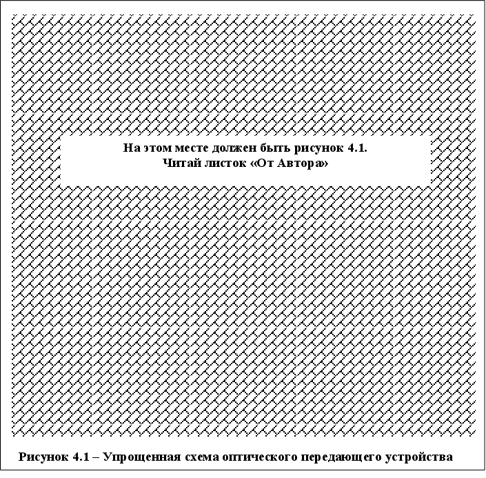 95 От Автора. Тема дипломного проекта: «Передающее устройство одноволоконной оптической сети». Сдавался в Киевском политехническом институте (КПИ) на Радиотехническом ф-те в феврале 2001г. Сдан на «отлично», хотя любой другой его может сдать на 3 балла, если вообще «бестолочь». Вообще-то оценка зависит на 90% от ващего доклада! Т.е. как вы комиссии свой дилом изложите, как на вопросы будете отвечать - так и оценку поставят. Диплом имеет достаточно современную и актуальную тему, которая подходит практически для любого вуза или техн. училища ПО СПЕЦИАЛЬНОСТИ РАДИОТЕХНИКА, СВЯЗЬ, и тому подобные. Данный диплом в полном варианте(!!!) т.е. уже практически в чистовом виде. Выпонен полный расчёт принципиальной схемы передатчика и расчёт источника питания. Если вы хотите переделать его под себя – вам остаётся только внимательно его прочитать и изменить некоторые названия городов и ГОСТов. На пример в разделе “ Мероприятия по Охране Труда” есть такая фраза: “В рабочем помещении выполнены все требования по пожарной безопасности в соответствии с требованиями НАПБ А.01.001-95 «Правил пожежної безпеки в Україні». И вы должны написать тип требований который действует у вас в России например. А всё остальное в принципе остаётся без изменений. К диплому прелагается 7 чертежей формата А1: