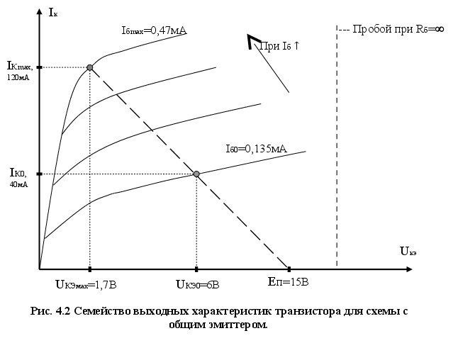 где Pпр=-50 ДБ – уровень оптического сигнала на приёме. То есть мощность излучения на выходе передающего модуля должна быть не менее 1.5 мвт, что и требуется в техническом задании. Коме того, источник излучения по ТЗ должен работать на длине волны 0.85 мкм и обеспечивать частоту модуляции не менее 8.5 МГц. Полупроводниковый лазер ИЛПН-203 наилучшим образом отвечает приведённым требованиям и имеет следующие характеристики: мощность излучения: Риз=3.5 мВт; длина волны излучения: =0.85 мкм; ширина спектра излучения: =3 нм; частота модуляции: Fмод=250 МГц; ток накачки: Iн=120 мА; пороговый ток: Iпор=40 мА. Расчёт выходного каскадаПри выборе транзистора будем руководствоваться следующими требованиями к его техническим характеристикам: -постоянный ток коллектора не менее 120 мА; -предельная частота усиления более 8.5 МГц; Приведённым требованиям удовлетворяет кремниевый n-p-n транзистор КТ660Б. Данный транзистор предназначен для применения в переключающих и импульсных устройствах, в цепях вычислительных машин, в генераторах электрических колебаний и имеет следующие электрические параметры: -статический коэффициент передачи h21э тока в схеме ОЭ при Uкб=10 В, Iэ=2 мА: h21эмин = 200, h21эмакс = 450; -напряжение насыщения коллектор – эмиттер Uкэнас при Iк=500 мА, Iб=50 мА, не более: 0.5 В; -напряжение насыщения коллектор – эмиттер Uкэнас’ при Iк=10 мА, Iб=1 мА, не более: 0.035 В; -напряжение насыщения база – эмиттер Uбэнас при Iк=500 мА, Iб=50 мА, не более: 1.2 В; -емкость коллекторного перехода Ск при Uкб=10 В, не более: 10 пФ; -обратный ток коллектора Uкобр при Uкб=10 В, не более: 1 мкА; -обратный ток эмиттера Uэобр при Uбэ=4 В, не более: 0.5 мкА; Предельные эксплуатационные данные: -постоянное напряжение коллектор– база Uкбmax: 30 В; -постоянное напряжение коллектор– эмиттер Uкэmax при Rбэ<1 кОм: 30 В; -постоянное напряжение коллектор–эмиттер Uкэmax при Iэ10мА: 25 В -постоянное напряжение база–эмиттер Uбэmax: 5 В; -постоянный ток коллектора Iкmax: 800 мА; -постоянная рассеиваемая мощность коллектора Pmax: 0.5 Вт. Далее зададим режим работы транзистора (рабочую точку). Для выбора режима используется семейство выходных характеристик транзистора для схемы с общим эмиттером, параметром которых является ток базы (рис. 4.2).