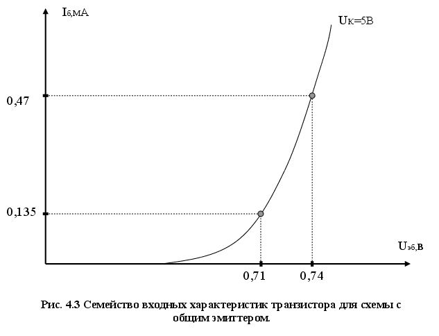 При этом должно выполняться следующее условие для напряжения покоя коллектора: Uкэо 0.45Еп. Пусть (с учётом приведённого условия) Uкэо=6 В. Поскольку для модуляции полупроводникового лазера необходим пороговый ток 40 мА, то Iко=40 мА, тогда ток покоя базы Iбо=0.135 мА. Поскольку максимальный ток накачки лазера 120 мА, то максимальный ток коллектора составит Iкmax=120 мА, тогда Uкэmax=1.7 В и Iбmax=0.47 мА. По входным характеристикам транзистора (рис.4.3) определим напряжение базы покоя Uбо=0.71 В и амплитудное значение Uбmax=0.74 В.