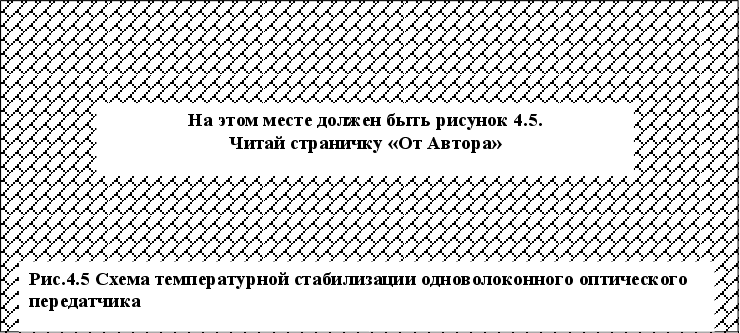 4. Расчёт электрической принципиальной схемыОбщие соображения по расчёту принципиальной схемы устройстваПервым этапом при проектировании принципиальной схемы передающего устройства волоконной оптической системы передачи является выбор типа и марки оптического излучателя исходя из предъявляемых к его техническим характеристикам требований. К основным техническим характеристикам излучателей относятся: -мощность излучения; -длина волны излучения; -ширина спектра излучения; -частота модуляции; -ток накачки; -пороговый ток. Принципиальная схема будет составляться исходя из рассмотренных пунктов «2.6.1.Виды модуляции» и «3.Выбор и обоснование структурной схемы». Как уже говорилось, наилучшим вариантом реализации одноволоконной оптической системы передачи является схема с модуляцией по интенсивности с применением оптических разветвителей (см. рис 3.1.). В нашем случае проектирование схемы волоконнооптической системы передачи включает в себя составление следующих узлов: -входной согласующий усилитель; -выходной каскад(схема прямого модулятора); -устройство автоматической регулировки уровня (АРУ) оптического сигнала на выходе; -система термостабилизации; -источник питания разрабатываемой волоконнооптической системы передачи; Упрощённая схема оптического передающего устройства представлена на рис. 4.1. Согласующий усилитель (СУ) предназначен для усиления сигнала, поступающего с преобразователя кода (с уровнями логического нуля и единицы 0.7 и 5В), до уровня необходимого для модуляции оптической несущей. Модулятор (МОД) предназначен для изменения параметров оптической несущей в зависимости от изменений входного сигнала. В нашем случае выбрана классическая схема прямой модуляции в которой модулирующий сигнал управляет мощностью оптической несущей. В результате мощность излучения изменяется по закону изменения модулирующего сигнала . Схема термостабилизации (СТС) предназначена для обеспечения постоянства выходной мощности излучателя.