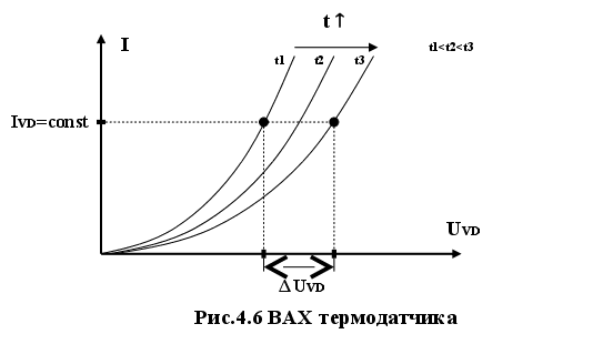 На рис. 4.5 представлена принципиальная схема термостабилизации одноволоконного оптического передатчика. Эта схема построена из следующих составных частей: -генератор стабильного тока(ГСТ); -температурный датчик(диод); -усилитель; В генераторе стабильного тока ток через транзистор VT2, при равенстве сопротивлений R1 и R2, одинаков с током через VT1 и не зависит от сопротивления нагрузки коллекторной цепи VT2. В правую ветвь включен диод VD у которого ВАХ при различных показаниях температуры имеет следующий вид (рис.4.6):