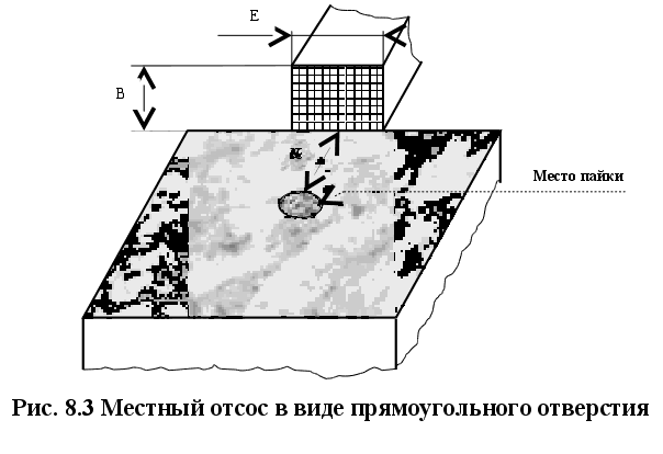 По таблице П1 [9] определяем значение нормированной освещённости. Для работ высокой точности (объект различения от 0.3 до 0.5 мм) со средним контрастом объекта различения с фоном при среднем фоне находим Ен=400лк. Так как рассчитанное фактическое значение освещенности больше нормированного, делаем вывод о пригодности системы освещения в помещении. 8.5 Мероприятия по улучшению условий труда 8.5.1 Расчёт местного отсоса Поскольку концентрация аэрозоля свинца в воздухе превышает предельно допустимую норму, то необходимо применить местную вентиляцию. Вентиляционная установка включается до начала работы и выключается после её окончания. Работа вентиляционных установок контролируется с помощью световой сигнализации. Разводка вентиляционной сети и конструкция местных отсосов обеспечивает возможность регулярной очистки воздуховодов. Электропаяльник в рабочем состоянии находится в зоне действия вытяжной вентиляции. Метеорологические условия на рабочих местах должны соответствовать ГОСТ 12.1 005-88. Местная вентиляция при пайке является наиболее эффективным и экономическим средством обеспечения санитарно-гигиенических параметров воздушной среды в рабочей зоне. Широкое применение при пайке имеет местная вытяжная вентиляция , которая условно разделяется на местные отсосы открытого и закрытого типа. В данном случае, для улавливания выделяющихся при пайке вредных паров используем местный отсос в виде прямоугольного отверстия (рис.8.3)
