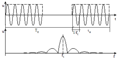 Рис. 2.2.1 Временная и спектральная диаграммы радиоимпульсов, отраженных от цели и поступающих на вход РПрУ