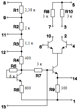 Рис. 4.9.2: принципиальная схема ИМС К175УВ4 Назначение выводов: 1 - общий; 2 - выход 1; 3 - внутренний нагрузочный резистор 1; 4 - вход1; 5 - общая точка внутренних нагрузочных резисторов; 6 - вход 2: 7 - внутренний нагрузочный резистор 2; 8 - +Uпит ; 9 - вывод делителя напряжения 1; 10 - выход 2; 11 - вывод делителя напряжения 2; 12 - вывод делителя напряжения 3; 13 - вход регулировки усиления; 14 - вывод установки и контроля режима. Данные для расчёта: Частота сигнала fпч = 30 МГц Коэффициент усиления К= 6×103 Искажения переднего фронта импульса tу = 0,09 мкс; Для использования в детекторе из литературы [3] выбираем детектирующий полупроводниковый диод Д9Б, т.к. его характеристики удовлетворяют следующим требованиям: fпч = 30 МГц < fд = 40 МГц; Cд = 1...2 пФ; Uпр = 0,9 В; Iпр = 90 мА; Ri = 10 Ом; Uобрmax = 10 В; Iобр = 250 мкА; Rобр = 0,4 МОм. Данные для расчёта: Частота сигнала ПЧ fпч = 30 МГц; Параметры входного контура Lк =50 нГн; Ск = 2 пФ; Допустимые искажения импульса : Время нарастания импульса tу =0,2 мкс; Время спада импульса tсп = (0,3...0,5)×tи = (0,3...0,5)×1 = 0,3 мкс; UвхДет = 0,5 В; Kд ~ 0,8 ...0,9. 5.Расчет элементов принципиальной схемы приемника 5.1. Антенный переключательОдним из основных узлов РЛП является антенный переключатель (АП).Антенные переключатели предназначены для коммутации передатчика к антенне на время прихода отраженных или ответных сигналов. Они должны: обеспечить уменьшение до минимума мощности излучаемого зондирующего импульса просачивающегося на на вход приемника; быть быстродействующими т.к. с увеличением времени срабатывания возрастает вероятность пробоя входных цепей приемника, а с увеличением времени востановления увеличивается минимальная дальность РЛС (мертвая зона обзора на малых расстояниях от РЛС); иметь минимальные потери мощности при излучении зондирующего импульса и особенно при приеме отраженного от цели сигнала; обладать большим сроком службы и высокой надежностью. Коммутационные АП состоят настроенных отрезков линий и газоразрядных приборов (разрядников), изменяющих сопротивление под действием мощных СВЧ сигналов. Разрядники включают в фидерный тракт РЛС параллельно или последовательно. АП на необратимых элементах применяют в РЛС сантимитрового диапазона. В качестве необратимых элементов используют фидерные вентили и циркуляторы. При расположении феррита волноводе , передаваемая по волноводу электромагнитная энергия. В зависимости от направления ее движения либо поглащается либо проходит практически без потерь. Феррит помещается в сильное поле постоянного магнита. При этом ферромагнитный резонанс наступает только при движении электромагнитной волны в одном направлении. При резонанасе практически вся СВЧ энергия в волноводе поглащается вентилем. Выбор типа АП зависит отмощности излучаемого зондирующего импульса. При мощности импульса 100-150 КВт АП реализуют путем последующего соединения ферритового циркулятора, газового разрядника и диодного резонансного СВЧ ограничителя (рис. ) При мощности 1-2 КВт газовый разрядник не вводят в состав АП. В АП (рис. ) используют два последовательно соединенных циркулятора Ц1 и Ц2. Сигнал от передатчика поступает на плече 1 циркулятора Ц1 и через плече 2 подается в антенну; при этом на выход плеча 3 сигнал от передатчика проходит с существенным ослаблением (13- 25 дб). Далее сигнал с плеча 3 циркулятора Ц1 подается через циркулятор Ц2 на разря