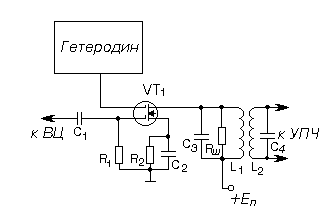 Округляем в большую сторону и получаем, что проектируемый ПФ должен состоять из (n+1)=2 элементов. Электрическая длинна li отрезков связанных линий всех звеньев фильтра одинакова: li =L0 /4, где L0 - длина волны в линии на частоте fс : L0 =f0 /2e, e - эффективная диэлектрическая проницаемость среды в линии, равная для симметричной полосковой линии относительной диэлектрической проницаемости диэлектрика линии. Для найденного значения n и заданного Lп =1,4 и Пп /f0 =0,2 определяем (n+1) коэффициент qi (табл. 3.4) [9], которые представляют собой перепады характеристических сопротивлений ступенчатого перехода: q1 =q3 =833,56 q2 =374123 Затем определяем величину переходных затуханий связанных звеньев (дБ): Сi =10lg(qi +1) q1 =q3 =833,56 q2 =374123 C1 =C3 =29,2 дБ C2 =55,7 дБ Теперь по таблице 3.5 [ 9 ] определяем для каждого звена bi /d и Si /d b1 /d=b3 /d=0,993 S1 /d=S3 /d=3,08 5.4. Преобразователь частоты (смеситель)Схема преобразователя частоты на полевом транзисторе с внешним гетеродином ([4]):