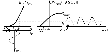 Основные параметры транзистора берём из справочника [ 5 ] . Uси =2 В . Rи =200 Ом . Iс о =5 мА . Uзи о =0,5 В . Sнач =6 мА/В Пользуясь характеристиками ПТ (рис.3), выбираем напряжение смещения: Eсм =UЗИотс /2=0,5/2=0,25 В Сумма амплитуд сигнала и гетеродина не должна превышать Eсм . Полагаем,что для ПТ крутизна при UЗИ =0: Sнач =6 мА/В, при UЗИ =UЗИотс /2: Sнач /2=1,5 мА/В Зависимость тока стока от напряжения затвор-исток UЗИ имеет вид: IС =0,5×Sнач ×(1+ UЗИ / UЗИотс )2 При подаче на вход смесителя напряжений сигнала uc =Uс coswc t и гетеродина uг =Uг coswг t получаем амплитуду тока частоты wп =wг -wс : Iп =0,5×Sнач ×Uñ ×Ur / UЗИотс Крутизна преобразования: Sпр =1/2×Sм1 =1/2×( Sмакс - Sмин )/2=(6-1,5)/4=1,12 мА/В Зададимся L1 = L2 = 1 мкГн; Ñ3 =С4 =1/((2×f0 )2 ×L)=1/((2×3,14×3×107 )2 ×10-6 )= =28×10-12 =28 пФ Характеристическое сопротивление контуров: