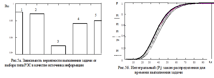 На рис.4а и 4б приведены результаты исследования зависимости вероятности выполнение задачи прицельным РЭК в зависимости от выбора РЭС в качестве основного источника информации (модель №1): 1-РЛС, 2-ТОВ, 3-ТПВ, 4-равновероятный выбор РЭС, 5-преимущество РЛС. На рис.5а приведена зависимость вероятности выполнение задача от выбора типа РЭС в качестве источника информации. На рис.5б приведены результаты исследований вероятности выполнение задачи от вероятности обнаружения целей РЛС (эта вероятность изменялась от 0,65 до1).