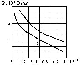 Рисунок 2. 3 – Зависимость удельной тепловой нагрузки звуковой катушки от величены свободного воздушного зазора:1) t = 20 0C; 2) t = 40 0C. Принимаем Рt = 2*103 Вт/м2 при t = 40 0C. 4 Определяем площадь боковой поверхности звуковой катушки: