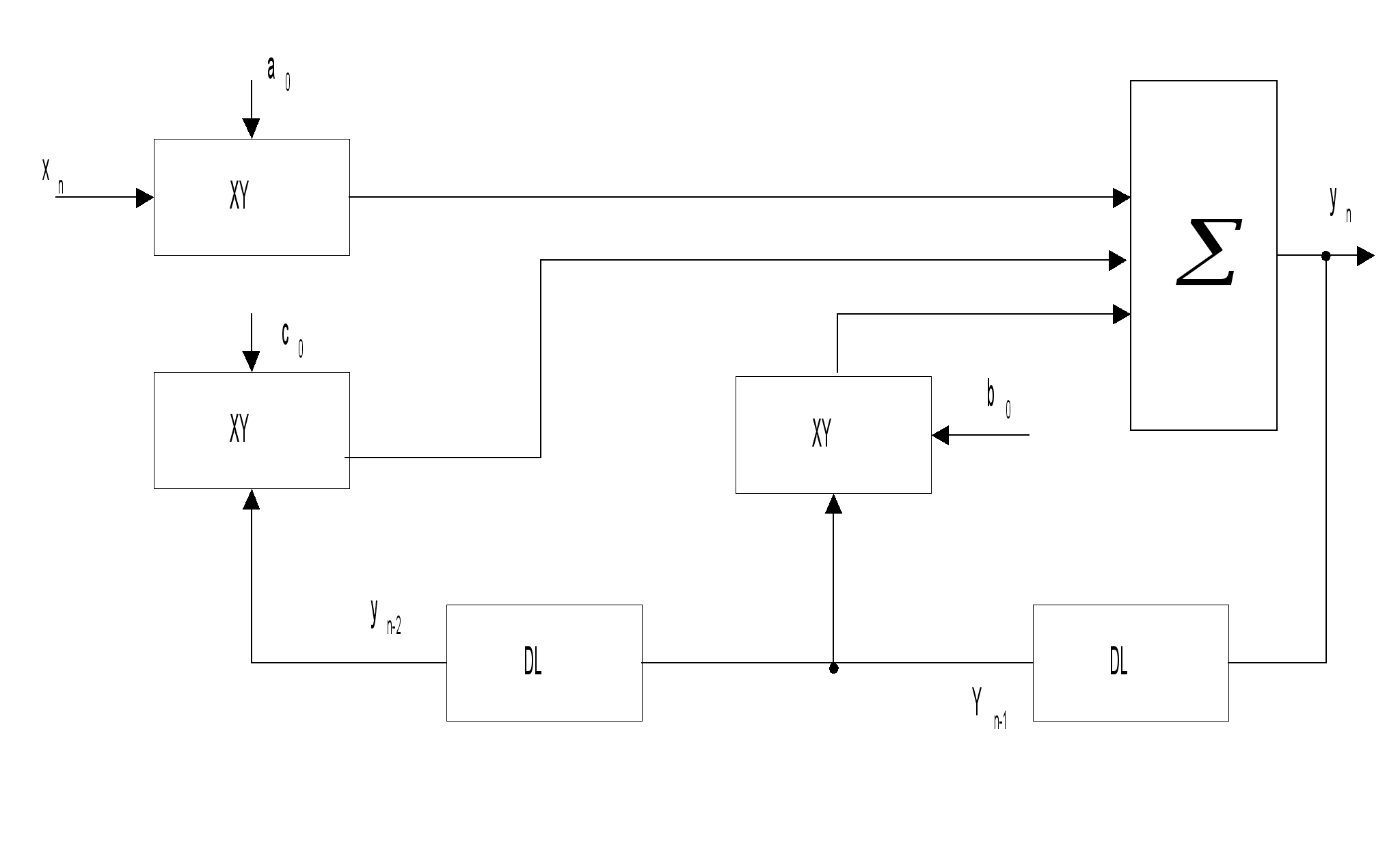 де m і k - кількість відліків, які обробляються цифровим фільтром в кожний момент часу (додатні цілі числа); aj, bj - коефіцієнти, які визначають характеристики фільтра. При наявності в правій частині рівняння членів виду Yn-j фільтр називається рекурсивним, при відсутності таких членів - нерекурсивним. Цифровий фільтр може бути реалізований як апаратурно, так і програмно. При апаратурній реалізації необхідними схемними елементами є перемножувачі, суматори і елементи затримки. На рис. 1 зображена структурна схема апаратної реалізації цифрового фільтра, який описується рівнянням: Yn = a0xn+a1xn-1+b1yn-1+b2yn-2
