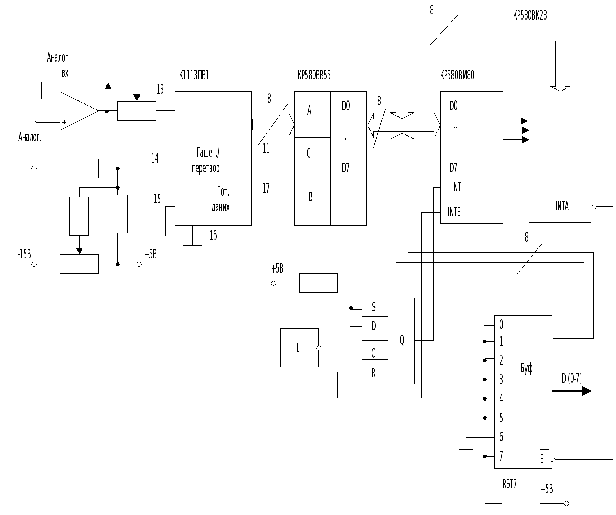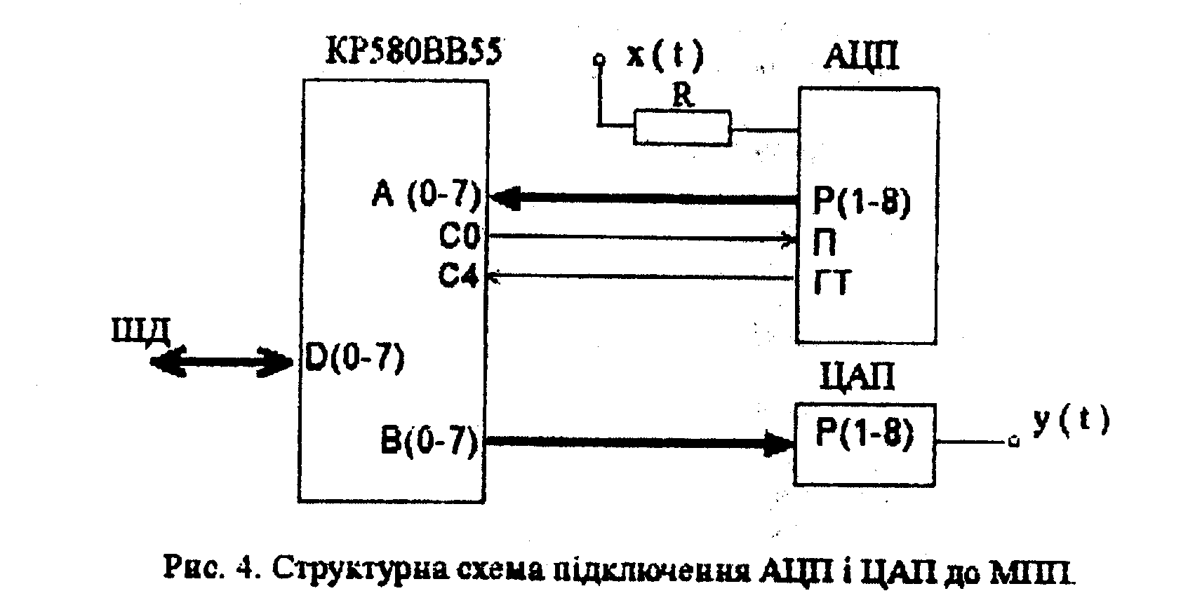 На аналогових вхід АЦП, подається сигнал х (t) через резистор R, який визначає масштаб перетворення. Цифрові виходи Р (1-8) АЦП підключені до каналу А ППІ. Виводи, що відповідають сигналам П (пуск) і ГТ (готовність), підключені відповідно до розрядів 0 і 4 каналу С. Цифрові входи ЦАП підключені до каналу В. На виході блоку ЦАП (з відповідними елементами) формується аналоговий сигнал у(t). Обмін між ППІ і МП здійснюється через виводи D (0-7), які підключені до шини даних. Канал А і половина каналу С (розряди 4-7) ППІ повинні бути запрограмовані на ввід інформації, канал В і друга половина каналу С (розряди 0-3) - на вивід. На рис.5,а зображено фрагмент схеми підключених АЦП до шин МПП в режимі вводу інформації через переривання при використанні команди RSTN (рестарт).