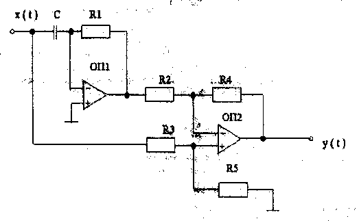 Рис. Структурна схема реалізації цифрового фільтра; XY - елемент множення; ВД - елемент затримки; - суматор . При побудові аналогової схеми, яка відповідає заданому пропорційно-інтегро-диференціальному рівнянню, варіанти рівнянь можна розділити на дві групи. Для варіантів 14-18 вихідний сигнал у (t) заданий явно через вхідний сигнал х (t). його похідні або інтеграл. Такий чином, аналогова схема для цих варіантів буде складатися з суматора, пропорційного елемента, диференціаторів та інтегратора. Кожний з цих елементів може бути побудований на основі операційного підсилювача [6]. На рис. 2 зображена аналогова схема, яка відповідає рівнянню варіант 14. На основі операційного підсилювача ОПІ зібрана схема диференціатора, а на ОП2 - схема додавання-віднімання. Сигнал на виході ОПІ визначається співвідношенням: z(t)=-R1*