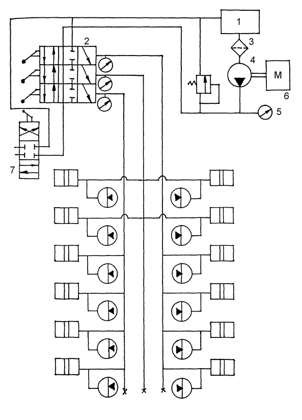 В данной таблице приняты следующие условные обозначения: Данные в таблице показывают, что при транспортировке крупногабаритных грузов не рационально стабилизировать платформу с точностью, превышающей 1°. Итак, здесь можно сделать следующие выводы: 1. Основным критерием при проектировании системы автоматической стабилизации пневмоколесной платформы является точность стабилизации. Точность стабилизации определяется устойчивостью платформы по опрокидыванию, и допустимым уровнем перегрузок опор. 2. Расчет точности стабилизации проектируемой пневмоколесной платформы позволяет для дальнейших исследований принять, что стабилизировать пневмоколесную платформу достаточно с точностью 1°. 2.3. Анализ существующих методов и средств стабилизации Автомобильные перевозки тяжелых и сверхтяжелых негабаритных грузов характеризуются большой сложностью в отношении как их организации, так и технического обеспечения особыми транспортными средствами. Преимущественное распространение в этих перевозках получили автомобильные поезда специализированного производства, обеспечивающие буксирование прицепов общей массой в несколько сотен тонн. Удовлетворить возрастающие требования к таким автопоездам, учитывая их недостатки, все труднее. Этим, видимо, можно объяснить появление нового типа транспортных средств для перевозки сверхтяжелых грузов - многоопорных пневмоколесных платформ (ПКП). Общий вид ПКП представлен на рисунке 2.1. Рис. 2.1. Общий вид ПКП Возможное число опор ПКП ограничено стандартами, которые заставляют увеличивать нагрузку на опору вплоть до максимальной по несущей способности дороги. В этом случае в качестве подвески приходится использовать гидравлические цилиндры. Известно, что при движении в несвязанных опорах возникает существенный разброс по нагрузкам. Стремление уменьшить разброс нагрузок по опорам (и, следовательно, по дороге) привел к организации балансирных гидравлических связей между гидроцилиндрами опор, делая их как можно обширнее. Поэтому все транспортные средства имеют три или четыре (не более) гидробалансира. Главное назначение балансирных гидравлических связей подвесок в группах и групп по трех- или четырехточечной опорной схеме - обеспечение равномерного распределения вертикальных нагрузок по опорам. При трехточечной структуре подвески (три гидравлических группы) ПКП может двигаться по наиболее неровной дороге благодаря отсутствию изгибных деформаций. При четырехточечной опорной схеме (четыре гидравлических группы) обеспечивается устойчивость, которой обладает обычный двухосный автомобиль нормальной компоновки. Рассмотрим известные электронные системы стабилизации ПКП. Среди них можно выделить две различные по назначению системы: равномерного подъема и опускания платформы для проведения бескрановых погрузочно-разгрузочных работ и систему стабилизации ПКП, которая обеспечивает горизонтальное положение платформы при движении по дороге. Наиболее широко используется электронные системы для обеспечения погрузочно-разгрузочных работ. Основным их достоинством является отсутствие необходимости делать поправки на утечки рабочей жидкости. Система электронного регулирования подъема платформы фирмы Камаг представлена на рисунке 2.2. она рассчитана на транспортные средства с че