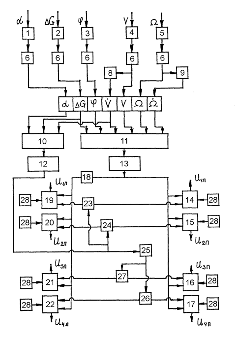 Автомобиль оборудован центральным вычислительным устройством 10, которое по заданной программе обрабатывает сигналы с датчиков 1-4 уровня кузова автомобиля, датчика 5 поперечного наклона, датчика 6 продольного наклона, датчика 7 угла поворота рулевого колеса, датчика 8 скорости автомобиля, задающего устройства 9, устанавливающего желаемый уровень кузова автомобиля, и определяет, необходимо или нет управление положением кузова. Если необходимо, то по предписанной программе центральное вычислительное устройство выдает управляющие сигналы на исполнительные органы 14-17 горизонтирующего устройства в соответствии с входными сигналами от датчиков 1-9. Основными недостатками этого устройства являются измерение хода подвесок и эвристический, а поэтому достаточно сложный алгоритм управления. Таким образом, ни одна из систем стабилизации подрессоренных масс автотранспортных средств, включая и ПКП, не способна обеспечить стабилизацию ПКП в горизонтальном положении при движении по дороге и при проведении бескрановых погрузочно-разгрузочных работ. Необходимо разрабатывать новую систему. Анализ технологических функций, выполняемых грузонесущей платформой большегрузного автотранспортного средства, показал, что система автоматической стабилизации пневмоколесной платформы должна выполнять три операции: сохранять горизонтальное положение платформы в движении, горизонтировать платформу при погрузочно-разгрузочных операциях и контролировать загрузку платформы. Последняя операция не относится к управлению платформой и поэтому рассматриваться не будет. Из физических соображений ясно, что для стабилизации платформы в горизонтальном положении достаточно управлять подачей рабочей жидкости в две гидравлические группы, например в группы 1 и 2. Тогда ограничений на подачу жидкости в третью группу нет. Система автоматической поперечной стабилизации пневмоколесной платформы фирмы Шаурле обеспечивает уменьшение затрат мощности за счет одновременной подачи жидкости в одну группу и слива рабочей жидкости из другой. Давление нагнетания в гидросистеме подвесок ПКП поддерживается постоянным. Отметим, что понятие стабилизации клиренса вполне совпадает с основным принципом, по которому осуществляет управление оператор: "на сколько поднял один борт, на столько же опустил другой". Этот же принцип по существу лежит в основе работы системы автоматической стабилизации в поперечном направлении пневмоколесной платформы фирмы Шаурле, крутосклонных тракторов и сельскохозяйственной техники, в основе стабилизации колесных машин. Но во всех этих системах стабилизации он решался конструктивно, поскольку рассматривалась стабилизация только одной угловой координаты, и поэтому в законах управления не фигурировал. При отсутствии ограничений в гидроприводе системы подрессоривания неровность, которую пневмоколесная платформа может преодолеть без потери платформой горизонтального положения, будет максимальна, если объем рабочей жидкости в гидрогруппах при преодолении этой неровности будет минимален. Рассмотренные системы стабилизации ПКП и подрессоренной массы автомобиля, а также общие принципы создания систем управления, показывают, что основой для разработки системы стабилизации ПКП является алгоритм управления системой подв