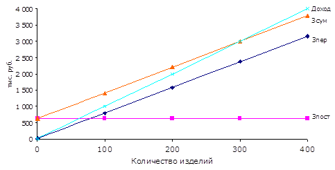 3.4.1. Расчет точки безубыточности. Т без. = З.пост / (Ц.изд - З.пер. на 1 изд.); где З.пост - это сумма расходов на заработную плату, отчисления во внебюджетные фонды, амортизацию, энергетические расходы. З.пер - это сумма затрат на покупку комплектующих, транспортные расходы, прочие расходы. Ц.изд - стоимость изделия, равная 10 000 руб. Т без. = 625 964 / (10 000 - 7 884) = 296 изд.
