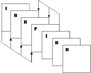 Рис 1.1 Видеопоследовательность трех видов изображений с предсказаниями (стрелками указаны направления предсказаний) 2. Компрессия изображений в MPEG -2. 2.1 Процесс сокращения избыточности С информационной точки зрения, каждое изображение представляет собой три прямоугольных матрицы отсчетов изображений: яркостную Y и две цветности Св и Сr. Стандарт MPEG-2 допускает различные структуры матриц (4:2:0; 4:2:2; 4:4:4). Каждое изображение делится на срезы, которые состоят из макроблоков. Макроблок содержит блоки размером 8х8 элементов изображения (реже 16х16 элементов); группу из четырех блоков с отсчетами яркости и группы блоков с отсчетами цветности, число которых зависит от формата (по 1, по 2, по 4). Группа следующих друг за другом макроблоков называется слайсом . Число макроблоков в слайсе может быть произвольным, главное, чтобы слайсы в изображении не перекрывались. Все структурные элементы потока видеоданных, полученных в результате внутрикадрового и межкадрового кодирования (кроме блока и макроблока), дополняются специальными и уникальными стартовыми кодами («Заголовок – элементы »). В заголовке приводится разнообразная дополнительная информация, например, размеры и соотношение сторон изображения, частота, кодирование, скорости потока, матрица квантования, формат дискретизации цветного изображения, координаты основных цветов и белого цвета, параметры матрицы для формирования яркости и цветоразностных сигналов и др. Сокращение пространственной избыточности выполняется в изображении типа I и достигается на уровне блока. Набор операций такого кодирования – дискретное косинусное преобразование; взвешенное квантование; энтропийное квантование (кодирование серии коэффициентов косинусного преобразования, полученного в результате диагонального сканирования матрицы). Для повышения точности предсказания используется компенсация движения: оценивается скорость перемещения движения объектов от кадров и при определенных предсказаниях производится коррекция в положении опорного изображения, по отношению к которому находится ошибка предсказания. Определение величины и направления смещения (вектор движения) производится на уровне макроблоков. Оценка вектора – сложная процедура, именно она определяет асимметрию кодека MPEG-2, однако в этом направлении ведутся работы, т.к. эта процедура не определена жестко. Стандарт предполагает сокращение не только пространственной, но и временной избыточности. После компрессии объем изображения Р типичных телевизионных сюжетов составляет 35% от I, В – 25% от I. Т.о., в три раза уменьшается скорость потока данных при приблизительно тех же искажениях. Артефакты же связанные с движением (в отличие от JPEG и DV) замечаемы тем меньше, чем быстрее движутся изображения. В случае чересстрочной развертки каждый кадр состоит из двух полей. Первое поле содержит нечетные строки кадра, а второе поле – четные строки. При этом возможно два варианта кодирования всего кадра, выбор одного из которых осуществляется на основе оценки движения в нем. В случае кадрового кодирования кодируемым изображением является полный кадр, который целиком хранится в запоминающем устройстве кодера. Кадровое кодирование выбирается в случаях, когда изменения во втором поле кадра относительно первого поля того же кадра незначительны. В слу